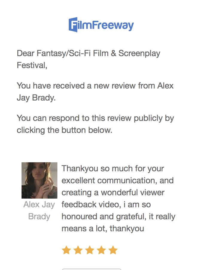 Today’s FilmFreeway Testimonial: FANTASY/SCI-FI Film Festival December 4, 2024 festreviews Uncategorized Deadline Today to submit via FilmFreeway: “Thankyou so much for your excellent communication, and creating a wonderful viewer feedback video, i am so honoured and grateful, it really means a lot, thank you” Share this: Click to share on X (Opens in new window) X Click to share on Facebook (Opens in new window) Facebook Click to share on LinkedIn (Opens in new window) LinkedIn Click to share on Tumblr (Opens in new window) Tumblr Click to share on Pinterest (Opens in new window) Pinterest Like Loading... Related