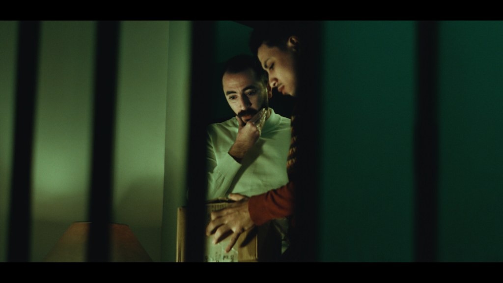 The eerie vocal chirps, minor key crescendos, jerky clangs, and ghostly tinny knocks throughout the film, all add to the ominous feel of the piece. The greenish hue of the lighting, as the film progresses, creates a queasy essence. The extreme close ups on faces, and slow pans of the camera around the forbidden left area bring us along with the curious friend who can’t resist disobeying what he has been told — it becomes quite apparent that the thrust of this film is a study of the human tendency to follow the lure of the forbidden.
