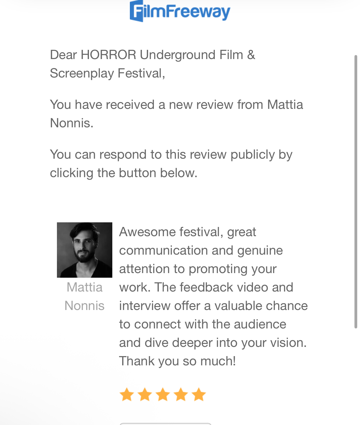Awesome festival, great communication and genuine attention to promoting your work. The feedback video and interview offer a valuable chance to connect with the audience and dive deeper into your vision. Thank you so much!