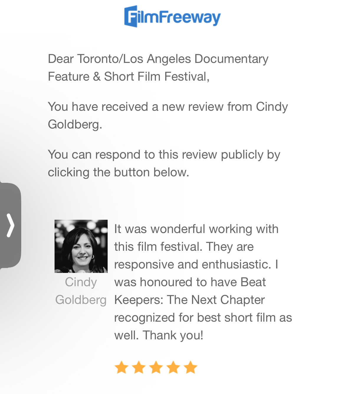 It was wonderful working with this film festival. They are responsive and enthusiastic. I was honoured to have Beat Keepers: The Next Chapter recognized for best short film as well. Thank you!