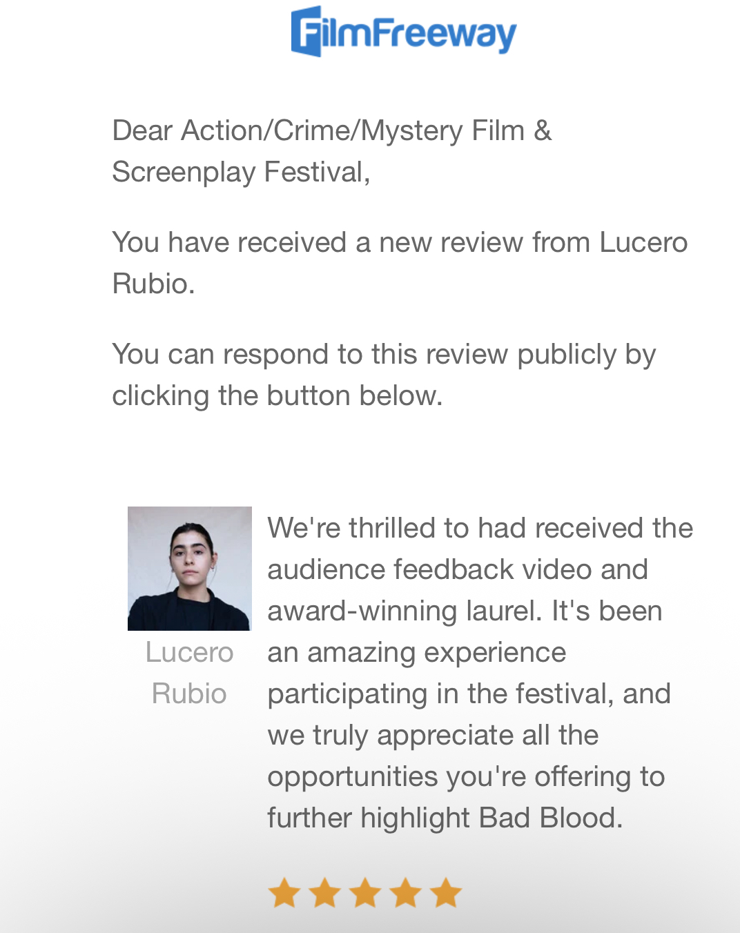 We’re thrilled to had received the audience feedback video and award-winning laurel. It’s been an amazing experience participating in the festival, and we truly appreciate all the opportunities you’re offering to further highlight Bad Blood.
