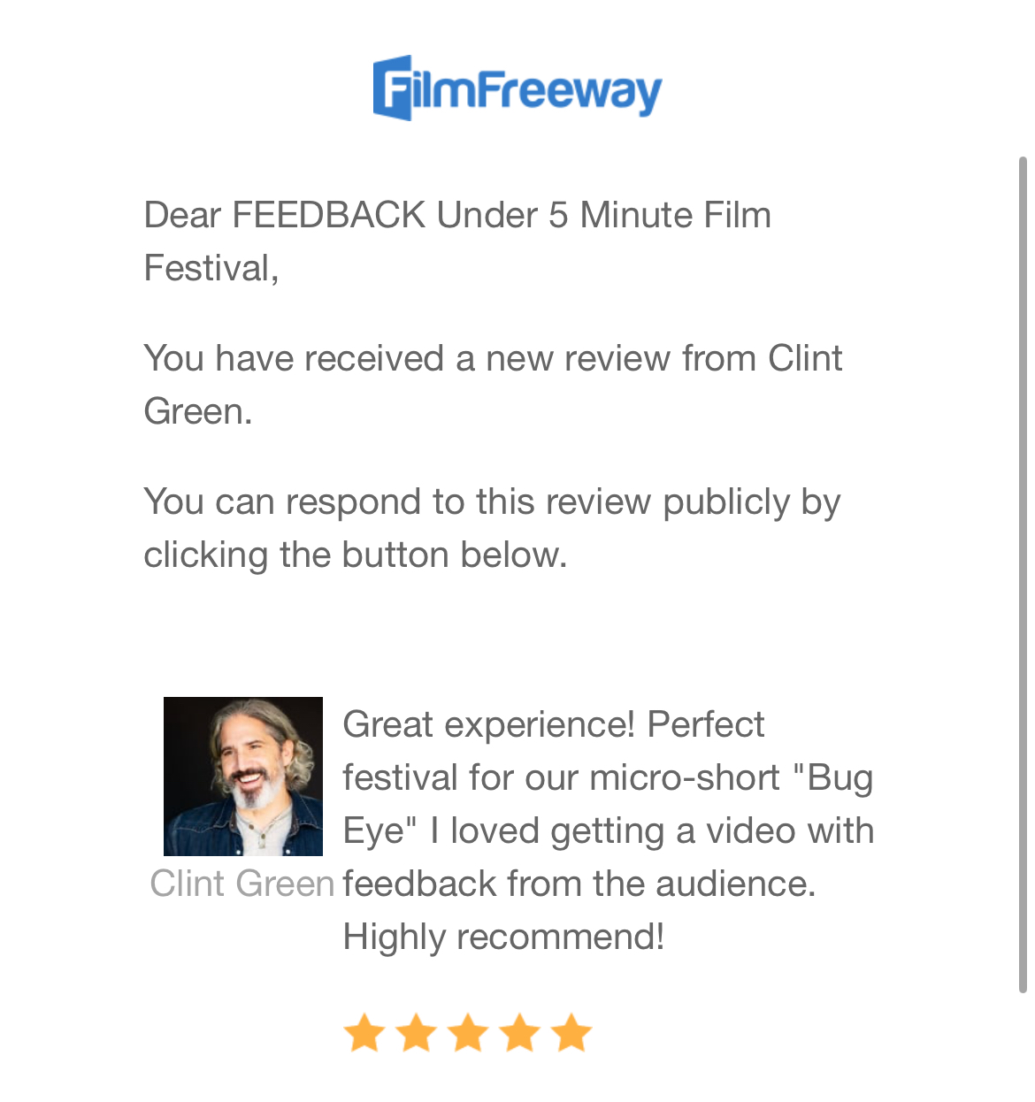 Today’s FilmFreeway Testimonial: UNDER 5 Minute Film Festival July 21, 2025 festreviews filmfreeway, FilmFreeway ReviewToday's FilmFreeway Testimonial: UNDER 5 Minute Film Festival Submit to the festival via FilmFreeway: Great experience! Perfect festival for our micro-short “Bug Eye” I loved getting a video with feedback from the audience. Highly recommend! Share this: Click to share on X (Opens in new window) X Click to share on Facebook (Opens in new window) Facebook Click to share on LinkedIn (Opens in new window) LinkedIn Click to share on Tumblr (Opens in new window) Tumblr Click to share on Pinterest (Opens in new window) Pinterest Like Loading... Related