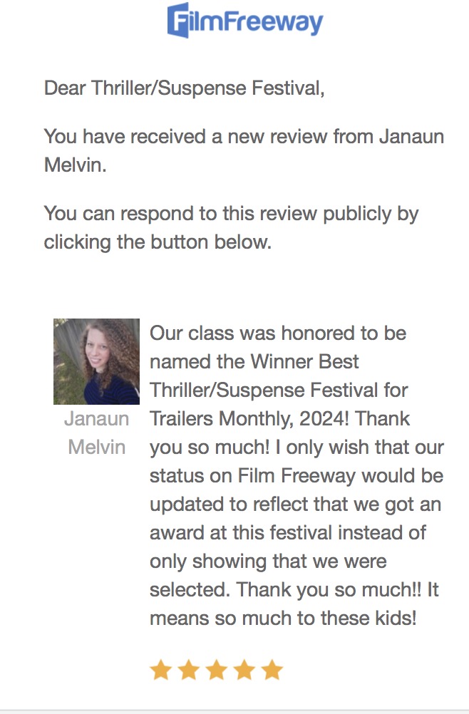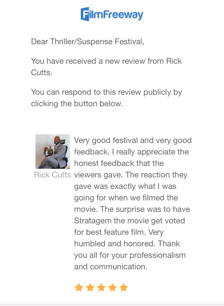 Very good festival and very good feedback. I really appreciate the honest feedback that the viewers gave. The reaction they gave was exactly what I was going for when we filmed the movie. The surprise was to have Stratagem the movie get voted for best feature film. Very humbled and honored. Thank you all for your professionalism and communication.