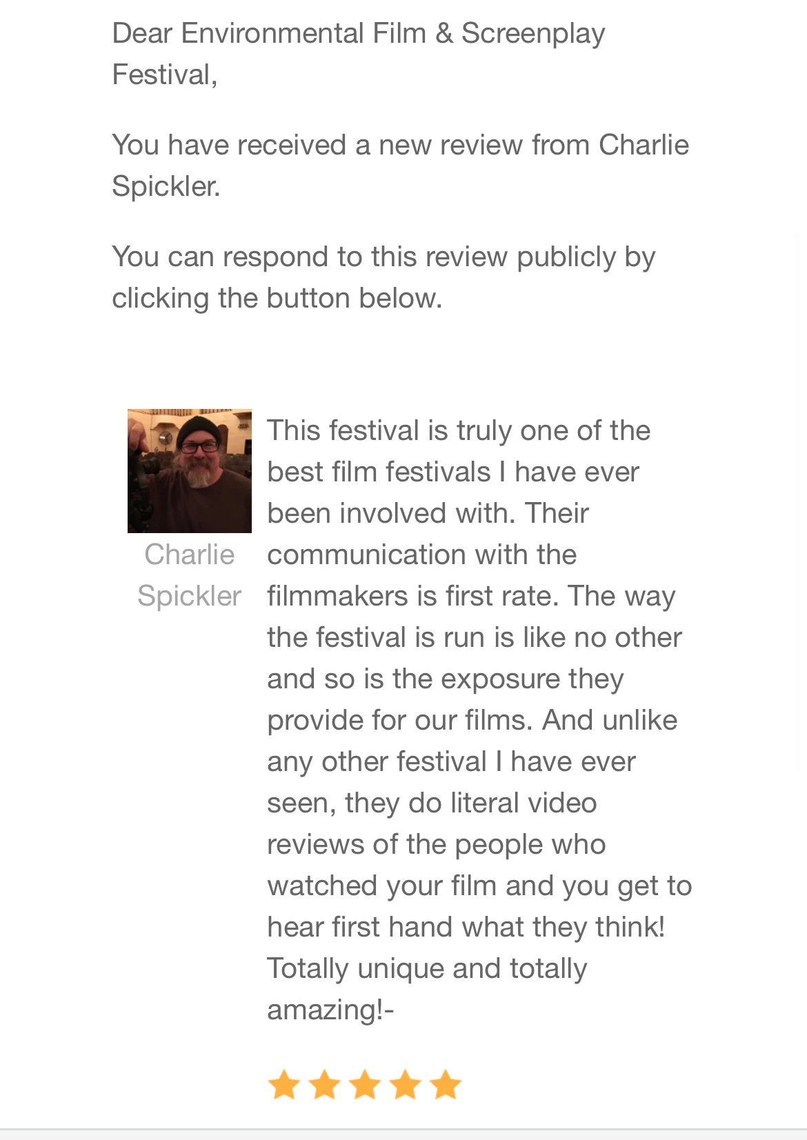 This festival is truly one of the best film festivals I have ever been involved with. Their communication with the filmmakers is first rate. The way the festival is run is like no other and so is the exposure they provide for our films. And unlike any other festival I have ever seen, they do literal video reviews of the people who watched your film and you get to hear first hand what they think! Totally unique and totally amazing!-