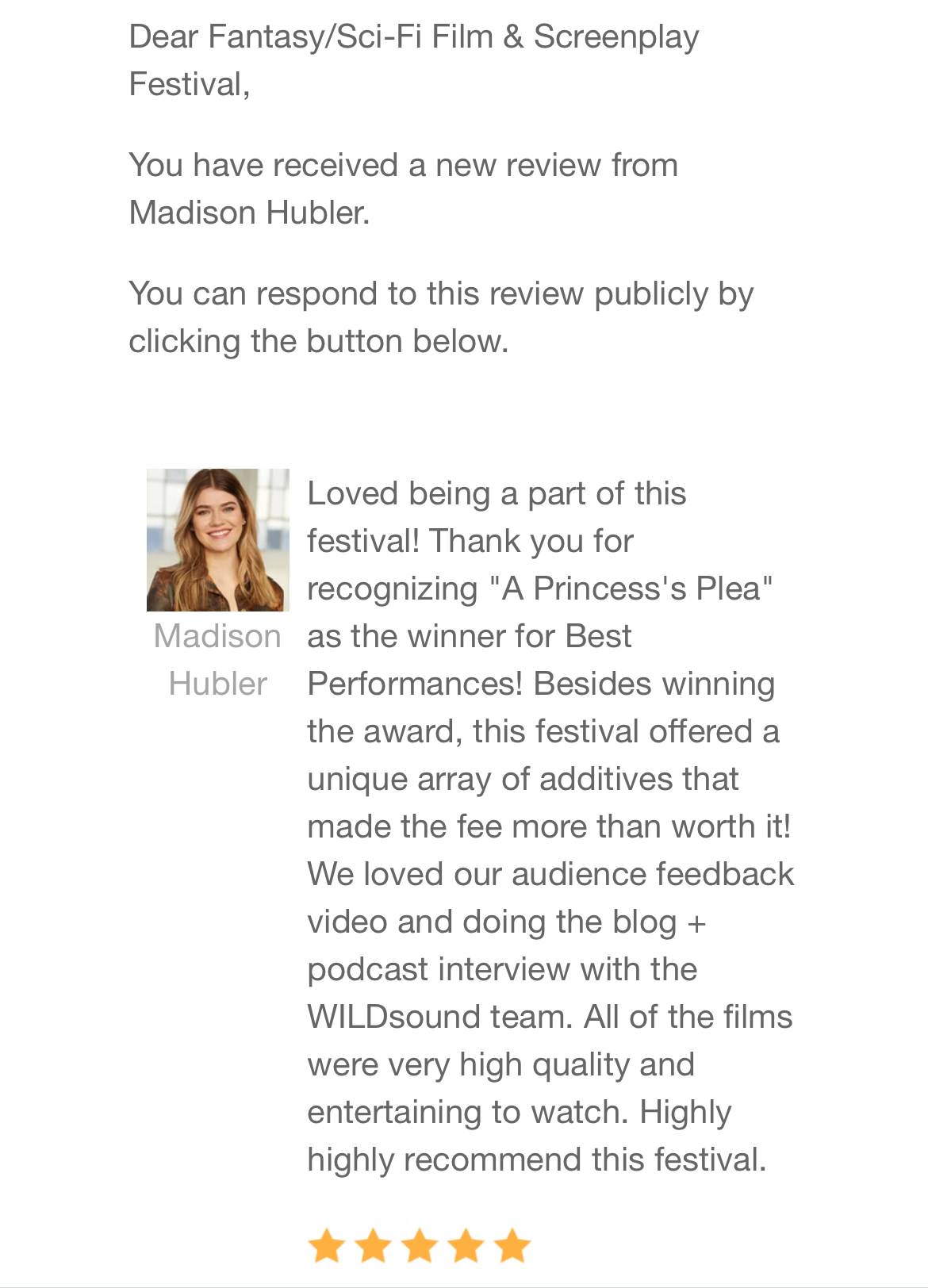 Loved being a part of this festival! Thank you for recognizing “A Princess’s Plea” as the winner for Best Performances! Besides winning the award, this festival offered a unique array of additives that made the fee more than worth it! We loved our audience feedback video and doing the blog + podcast interview with the WILDsound team. All of the films were very high quality and entertaining to watch. Highly highly recommend this festival.