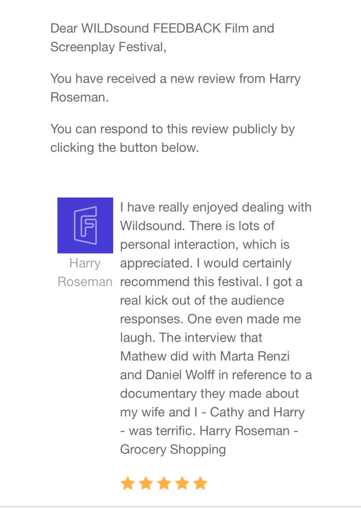 I have really enjoyed dealing with Wildsound. There is lots of personal interaction, which is appreciated. I would certainly recommend this festival. I got a real kick out of the audience responses. One even made me laugh. The interview that Mathew did with Marta Renzi and Daniel Wolff in reference to a documentary they made about my wife and I – Cathy and Harry – was terrific. Harry Roseman – Grocery Shopping