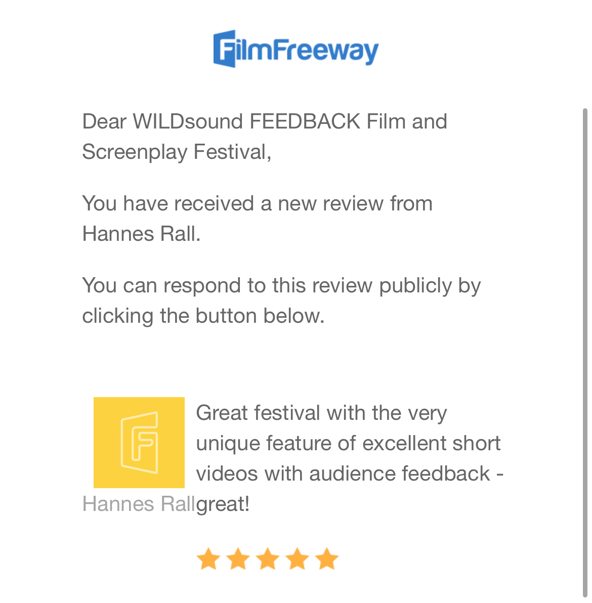 Today’s FilmFreeway Testimonial: WILDsound FEEDBACK Festival August 27, 2025 festreviews filmfreeway, FilmFreeway ReviewToday's FilmFreeway Testimonial: WILDsound FEEDBACK Festival Submit to the WILDsound Festival Today: Great festival with the very unique feature of excellent short videos with audience feedback – great! Share this: Click to share on X (Opens in new window) X Click to share on Facebook (Opens in new window) Facebook Click to share on LinkedIn (Opens in new window) LinkedIn Click to share on Tumblr (Opens in new window) Tumblr Click to share on Pinterest (Opens in new window) Pinterest Like Loading... Related