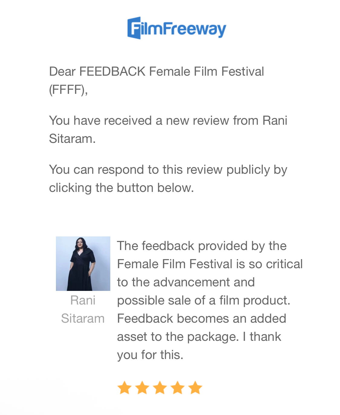 The feedback provided by the Female Film Festival is so critical to the advancement and possible sale of a film product. Feedback becomes an added asset to the package. I thank you for this.