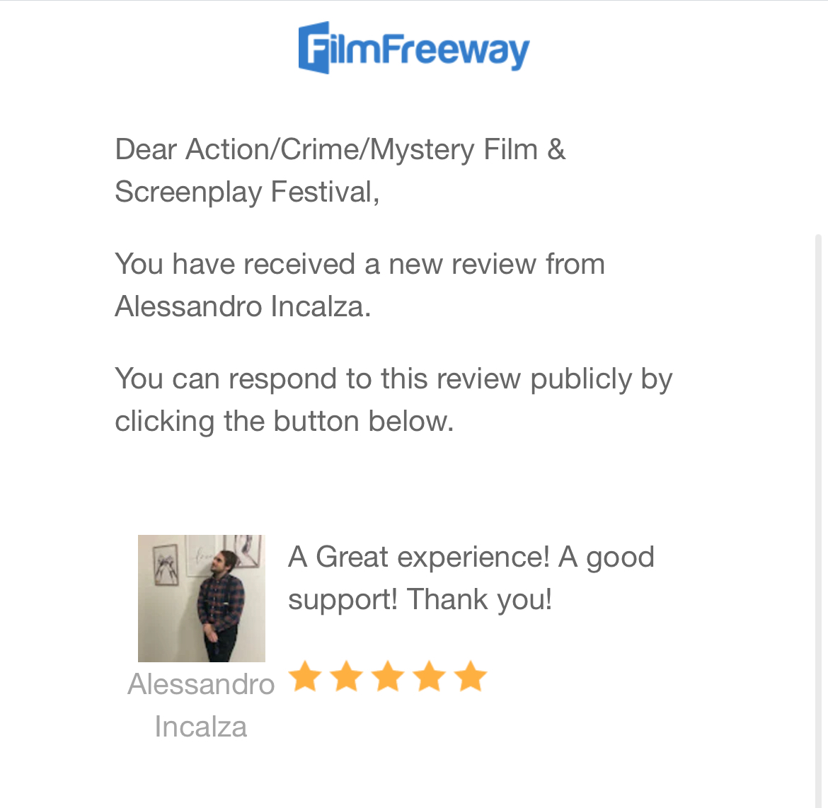 Today’s FilmFreeway Testimonial: ACTION/CRIME/MYSTERY Film & Screenplay Festival September 3, 2025 festreviews filmfreeway, FilmFreeway ReviewAction/Crime/Mystery Film & Screenplay Festival Submit to the Festival via FilmFreeway: A Great experience! A good support! Thank you! Share this: Click to share on X (Opens in new window) X Click to share on Facebook (Opens in new window) Facebook Click to share on LinkedIn (Opens in new window) LinkedIn Click to share on Tumblr (Opens in new window) Tumblr Click to share on Pinterest (Opens in new window) Pinterest Like Loading... Related