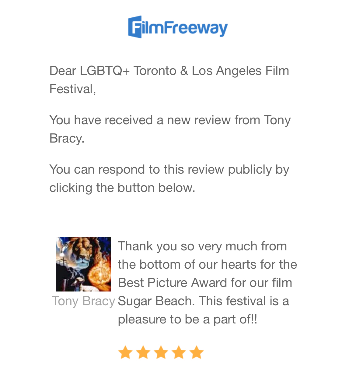 Today’s FilmFreeway Testimonial: LA/TORONTO LGBTQ+ Festival! September 6, 2025 festreviews filmfreeway, FilmFreeway ReviewToday's FilmFreeway Testimonial: LA/TORONTO LGBTQ+ Festival! Submit to the Festival via FilmFreeway: Thank you so very much from the bottom of our hearts for the Best Picture Award for our film Sugar Beach. This festival is a pleasure to be a part of!! Share this: Click to share on X (Opens in new window) X Click to share on Facebook (Opens in new window) Facebook Click to share on LinkedIn (Opens in new window) LinkedIn Click to share on Tumblr (Opens in new window) Tumblr Click to share on Pinterest (Opens in new window) Pinterest Like Loading... Related