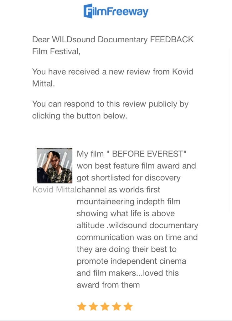 My film ” BEFORE EVEREST” won best feature film award and got shortlisted for discovery channel as worlds first mountaineering indepth film showing what life is above altitude .wildsound documentary communication was on time and they are doing their best to promote independent cinema and film makers…loved this award from them