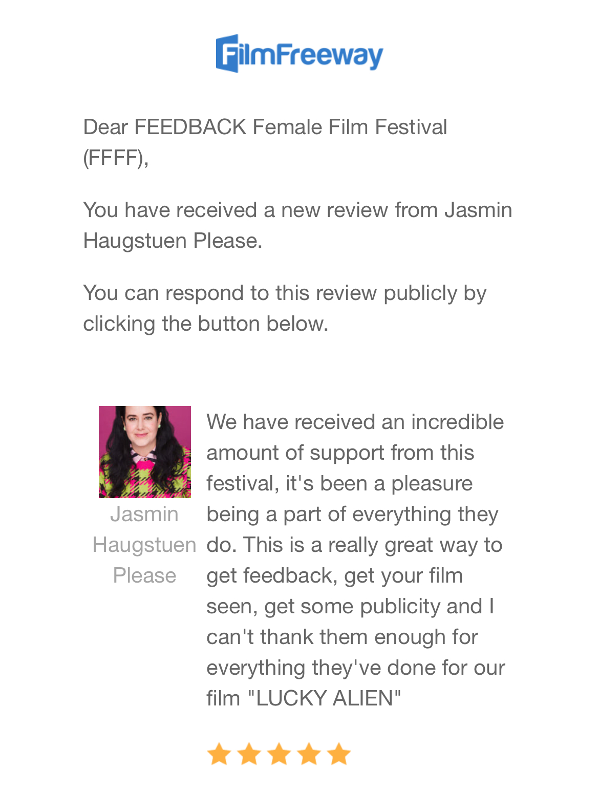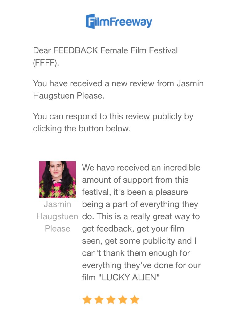 Today’s FilmFreeway Testimonial: FEMALE Feedback Film Festival (89 FIVE Star Reviews)