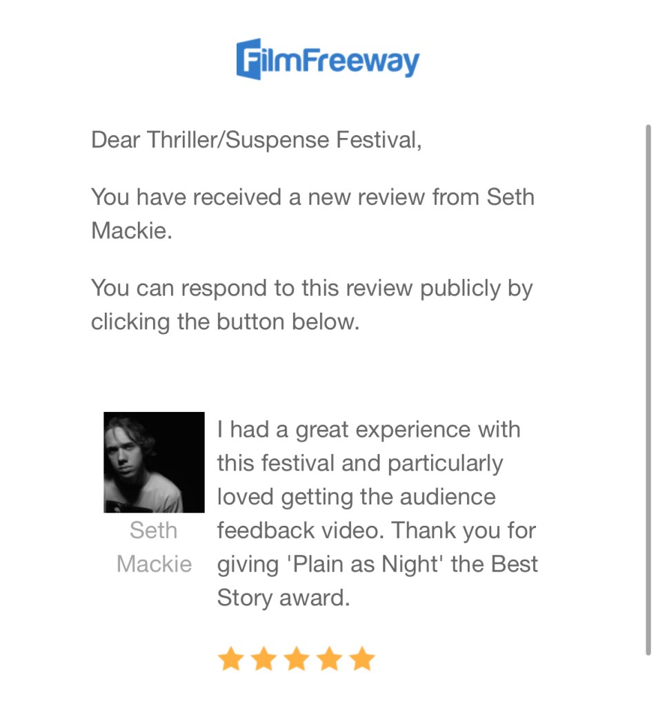 Today’s FilmFreeway Testimonial: THRILLER/SUSPENSE Festival (46 FIVE Star Reviews) November 16, 2025 festreviews Uncategorized Submit to the Festival via FilmFreeway. I had a great experience with this festival and particularly loved getting the audience feedback video. Thank you for giving ‘Plain as Night’ the Best Story award. Share this: Share this: Click to share on X (Opens in new window) X Click to share on Facebook (Opens in new window) Facebook Click to share on LinkedIn (Opens in new window) LinkedIn Click to share on Tumblr (Opens in new window) Tumblr Click to share on Pinterest (Opens in new window) Pinterest Like Loading... Related