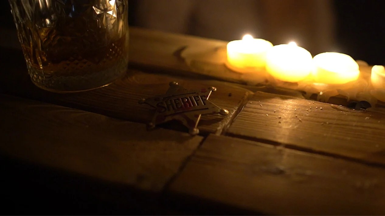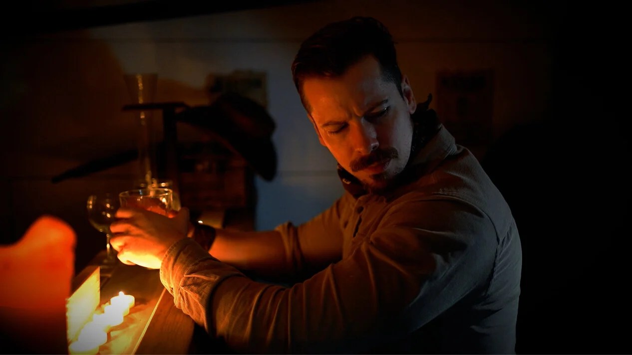 The location and props have all the trappings of a classic frontier tale – – the piece is set in a rickety wood saloon with flickering candlelight, and a sly, villainous face appears on yellowed ransom signs hanging on the dusty walls. As in many a barroom scene, the fight choreography is impressive, as is the resulting gore. Remarkable sound design engulfs the piece with atmospheric nuggets, such as heavy footsteps on the creaky floors, horses neighing, women screaming, gunshots, slow-paced harmonica, and the repeated use of a vibraslap to emulate a rattlesnake.