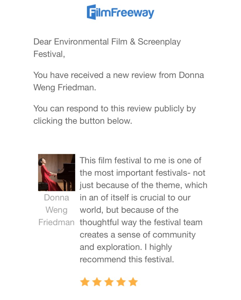 Environmental Film & Screenplay Festival was great. I am so grateful for the audience feedback. It was so fun and encouraging to see genuine reactions to my film. I will encourage anyone to share your film with the Environmental Film & Screenplay Festival.