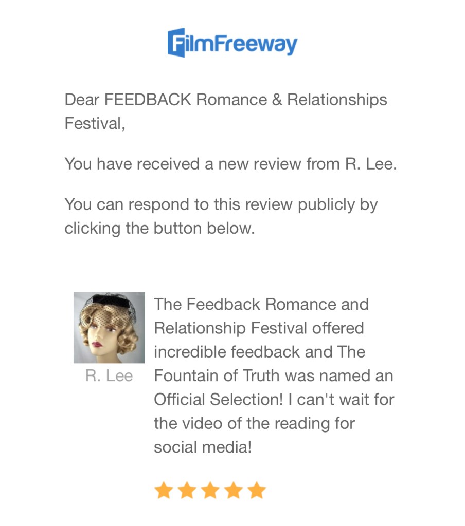 The Feedback Romance and Relationship Festival offered incredible feedback and The Fountain of Truth was named an Official Selection! I can’t wait for the video of the reading for social media!