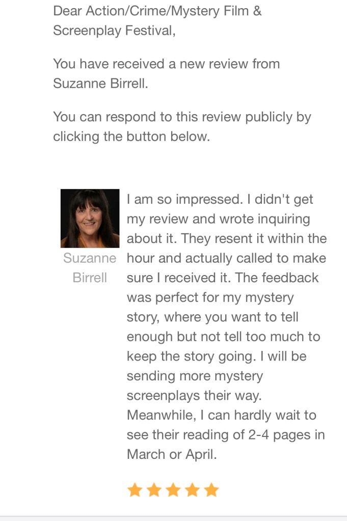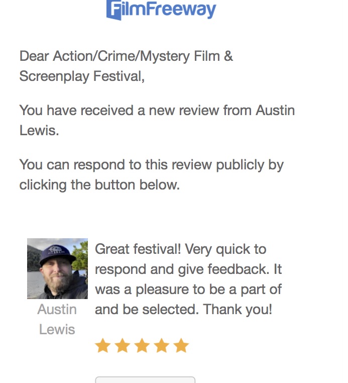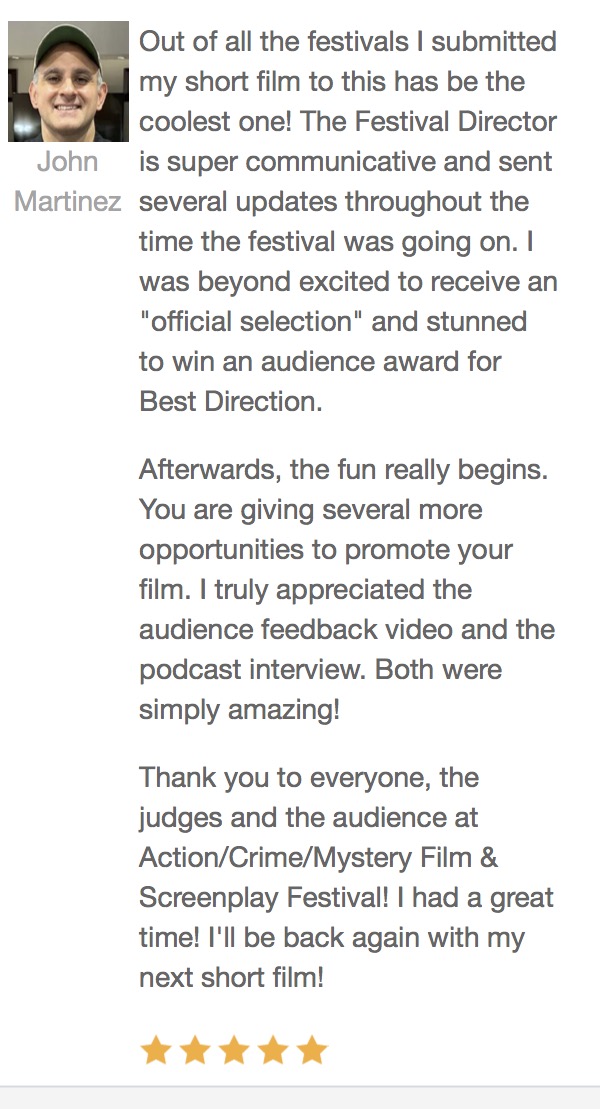 I can’t express how glad I am that I submitted to The Action/ Crime/ Mystery Film & Screenplay Festival! It’s been a fantastic experience all around! The format and organization make it streamlined and simple to participate in, they offer benefits that I’ve never seen at other festivals, and their process and assessment are well-rounded and fair. This will be my go-to festival from here on out!